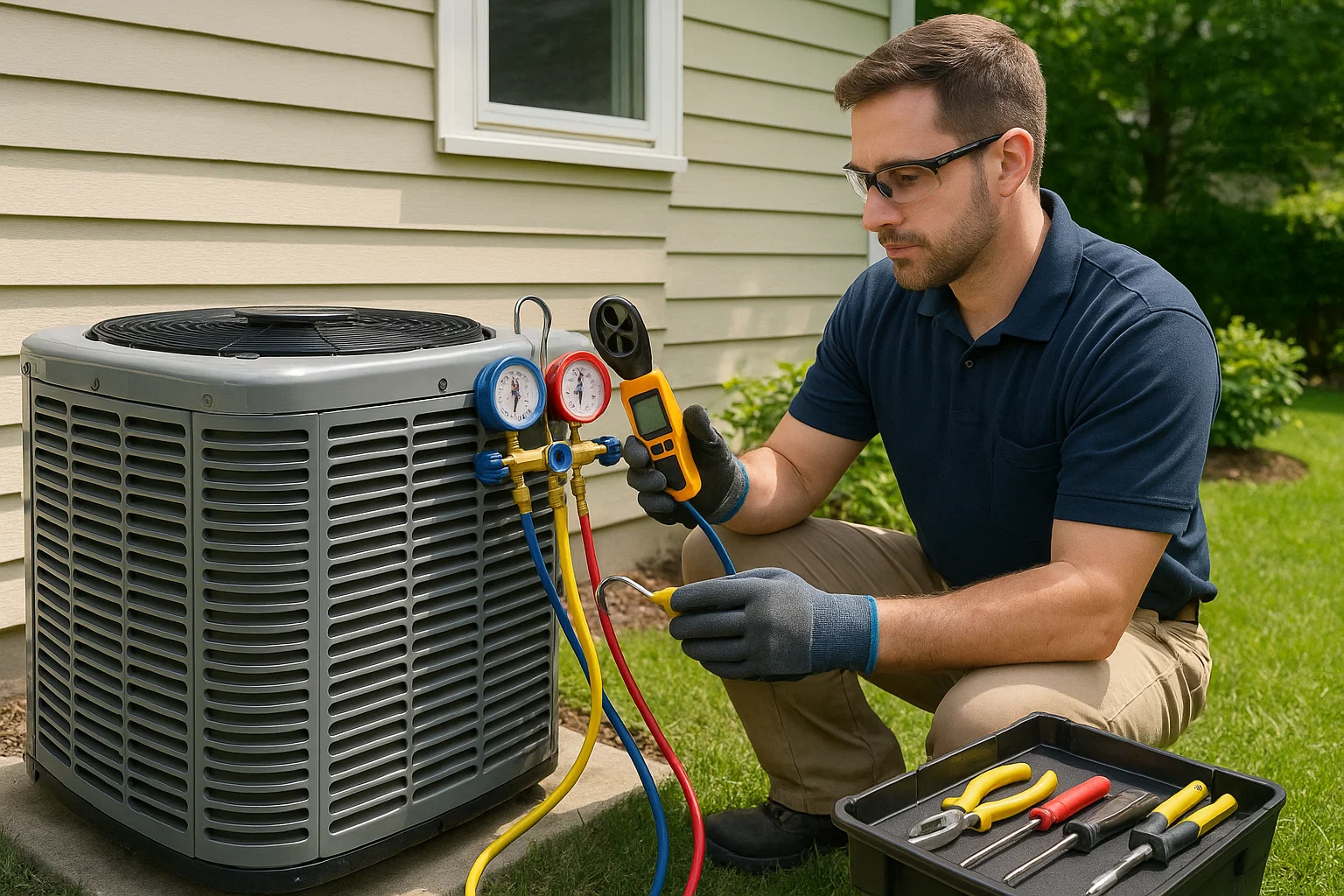 Technician inspecting outdoor AC condenser with gauges and airflow meter